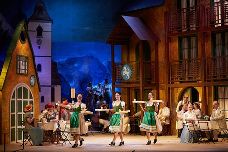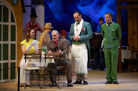 Ivana Medić u ulozi Josephe Vogelhuber ostvarila je ulogu vlasnice hotela dojmljivo, uključivši pritom i zahtjevnu tehniku jodlanja u svoj pjevački repertoar. Istaknula se posebice emocionalno pjevajući „Lijep je ovaj svijet“. U duetima i dijalozima sigurna i lijepog tona, u visinama je u više navrata bila nesigurna tijekom prvog čina. Gorana Biondić je ulogu kokete Ottilie izvela vjerno prema karakternom predlošku, stilski uvjerljivo frazirajući toplim tonom podjednako solo-nastupe i duete, ali također je u visinama pokazala više nesigurnih nastupa. Ženske glavne solističke uloge bile su izuzetno glumački angažirane, uz česte plesne točke, što je sigurno usmjerilo snagu klasičnih opernih pjevačica na glumu, tako da je posljedično povremeno popuštala inače prisutna kontrola glasa u visinama.Ivan Ćaćić je ulogu Leopolda Brandmeyera, šefa sale, glumio bogato razrađenim situacijskim manirama, pjevajući vrlo uvjerljivo neshvaćenog ljubavnika uz Ivanu Medić. Bojan Jambrošić kao odvjetnik Otto Siedler nametnuo se osobnim atributima glasa i glumom - uspješno u solo-arijama, kao i u duetima uz ples s Goranom Biondić. Nenad Tudaković je ulogu tvorničara Wilhelma Giesecka ostvario s prepoznatljivim darom za komiku i pjevački vrlo uredno, dok je Robert Adamček kao tvorničar Sigismund Sülzheimer nadmašio očekivanja kao izuzetan pjevač-komičar. Obiteljski trio Miroslav Čabraja kao Profesor Hinzelmann, Sanja Toth kao Märchenn, njegova starija kći i Antonija Pintarić, njegova mlađa kći u ulozi Klärchen, upotpunili su niz uspješnih nastupa koji su publici priredili neusiljenom i spontanom interpretacijom uloga. Sandra Lončarić sintetizirala je kvalitete glumice i osebujan glas u snažnoj ulozi Kancelarke. Valja istaknuti i uvjerljive nastupe Jasne Komendanović kao Jutte, kancelarkine osobne asistentice, Antonija Jakupčevića kao konobara Piccola, Danijele Božičević u ulozi poštarice Kathi, Mirne Vidović kao pastirice Zenzi, te Katarine Toplek i Igora Krišto kao Mladenaca. Svi su pjevači uloge izgradili vrlo precizno, radeći na karakteru, odavali su sigurnost u nastupu i u izuzetno zahtjevnim koreografskim točkama, dok su scenski pokret i gluma često izvlačili iz njih i one skrivene interpretacijske kvalitete.