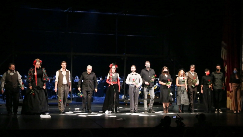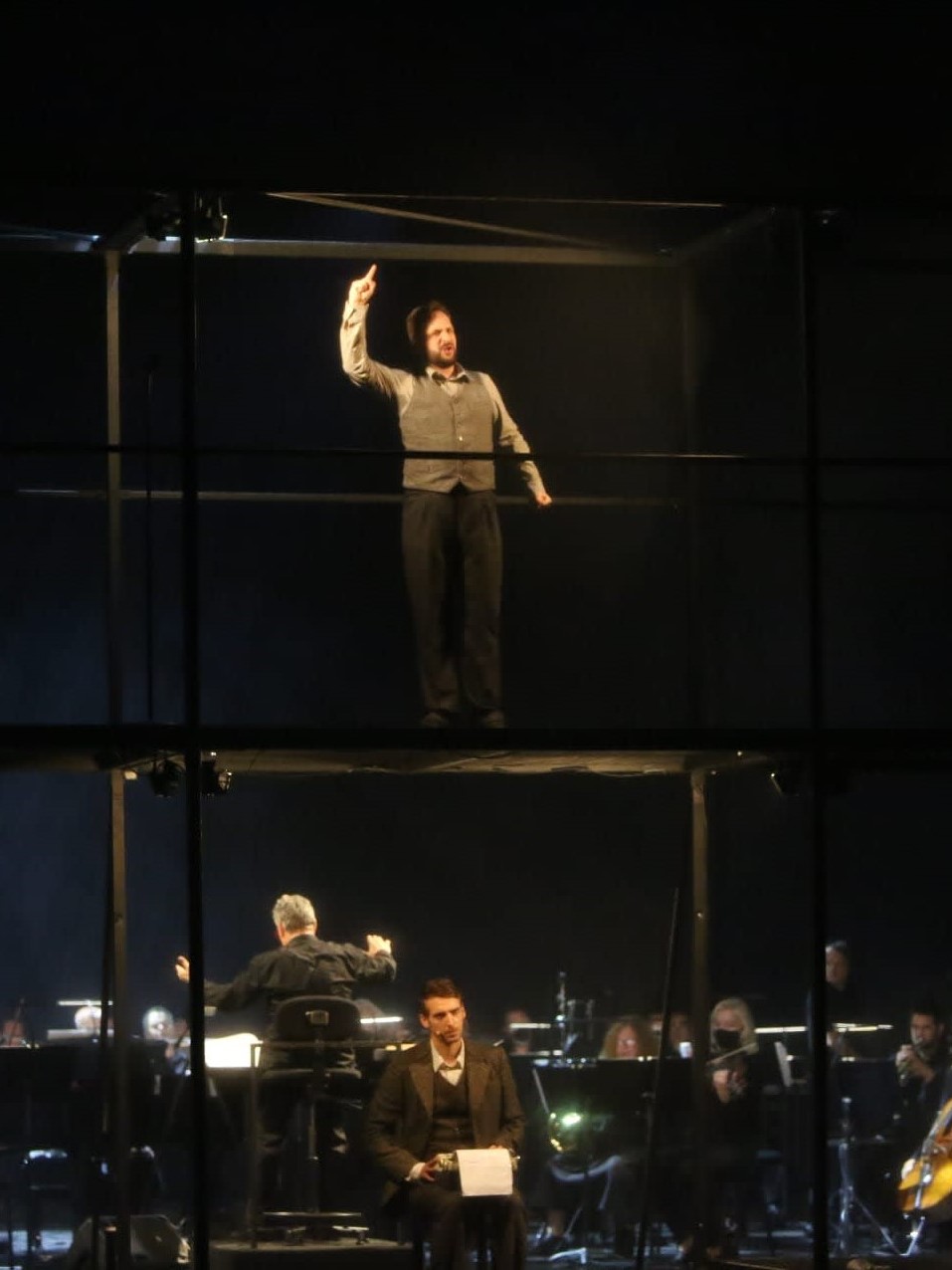 U izvedbenom smislu doneseno je puno od potencijala predstave. Berislav Šipuš bio je ujedno i dirigent praizvedbe. Orkestar i Zbor HNK Zagreb, u suradnji s kojim je predstava ostvarena, bili su dobro usmjereni ali tonski nedovoljno bogati, dijelom zbog smanjenog sastava ansambla koji je iz već poznatih razloga bio reduciran na sceni HNK, ali unatoč tome, u dinamičkom smislu i u smislu finoće i ljepote tona, kao i izgovora različitih jezika libreta, moglo se – pogotovo u zborskim dionicama, postići puno više. Solističku podjelu činili su uglavnom mladi pjevači, početnici u opernim izvedbama – istaknuo se bariton Jurica Jurasić Kapun, koji je u ulogama Drugog prijatelja, Prosvjednika, Vojnika i Ciganina pokazao zrelost u vladanju ulogom, lakoću interpretacije i ponajviše ljepotu i prirodnost fraze ispjevane glasom koji je bilo užitak slušati, što u operi nije naodmet.