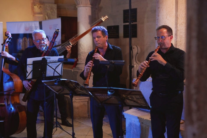 Koncert Muzika na vodi pratila je publika 14. Korčulanskog baroknog festivala na otvorenome prostoru u Atriju Gradske Vijećnice Korčula u utorak, 2. rujna 2025. s početkom u 21 sat. No, prije početka koncerta u 20 sati u istome je prostoru otvorena izložba Blaga Mađarskog nacionalnog muzeja na kojoj su posjetitelji (samo te večeri) mogli vidjeti neke od iznimno vrijednih predmeta iz muzeja utemeljenog 1808. godine o kome smo više napisali u osvrtu na koncert otvorenja, koji je 1. rujna 2025. priredio mađarski ansambl Aura Musicale. Izložbu je otvorila dr. Anna Erzsébet Mladenovics, ravnateljica Instituta Liszt – Mađarski kulturni centar Zagreb istaknuvši u nekoliko prigodnih riječi važnost muzejskih zbirki za mađarsku nacionalnu povijest, kulturu i umjetnost.