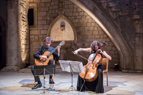 Duet violončela i gitare nije tako čest, ali kad ga svira dvoje vrhunskih umjetnika - kao što je to bilo u atriju Kneževog dvora 29. srpnja 2017, to predstavlja izuzetan umjetnički doživljaj. Riječ je o našim proslavljenim umjetnicima velike međunarodne reputacije - violončelistici Moniki Leskovar i gitaristu Petritu Çekuu. Program koji su osmislili bio je atraktivan s djelima Arcangela Corellija, Srđana Dedića, Franza Schuberta, Enriquea Granadosa, Manuela de Falle. Oboje glazbenika toliko su poznati javnosti da nije potrebno pisati o njihovim referencama.Umjetnici su započeli koncert Corellijevom skladbom La Follia (u prilagodbi za gitaru i violončelo Valtera Dešpalja) i odmah se osjetila velika lakoća sviranja, usklađenost, fine dinamičke amplitude, tako da je glazba strujala od paučinastog, jedva čujnog do velikog uzleta. Uslijedila je skladba Franza Schuberta Sonata u a-molu D 821, poznata pod imenom Arpaggione jer ju je autor napisao za ono vrijeme veoma popularni instrument istog imena, ali kako se on više ne upotrebljava, skladbu danas najčešće izvode violisti i violončelisti. Ovom prigodom Leskovar i Çeku su joj dali usklik poput prekrasnog lieda.