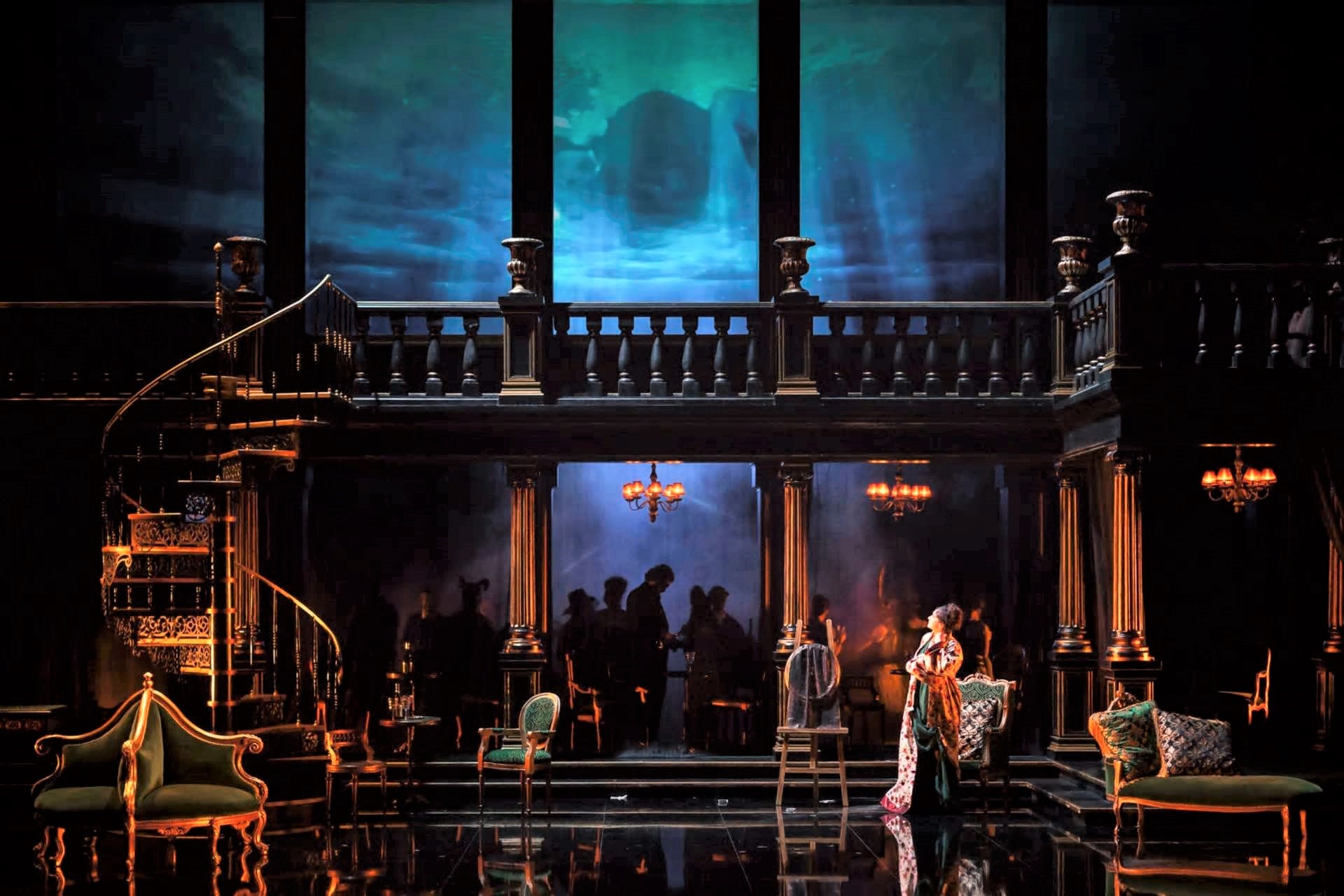 Osnovna redateljeva ideja čini se legitimnim postupkom redateljskog teatra. U snovima je sve moguće, pa tako i u Eleninim. U snovima je moguće da žena na jezeru poziva muškarca da dođe u njezin čamac a da je pritom jezero vizualizirano kao salon, a čamac kao sofa u njemu. U ponešto dosljednijim snovima vizualizirat će Elena i špilju i dvoranu na kraljevskom dvoru kao isti taj salon. S takvim vizualnim identitetom predstave, koji jest privlačan, Cenčić je djelu oduzeo ono po čemu je ono bilo novo u vrijeme praizvedbe – duh ranog romantizma; nešto što je, barem u libretu, imanentno ovom djelu. Rossini, koji je u žurbi često reciklirao brojeve iz prethodnih opera (osobito kad je mogao računati da ih publika neće prepoznati) u Ženi s jezera nije koristio odlomke iz ranijih opera (osim stalnih glazbenih formula), vjerojatno potaknut originalnim predloškom za libreto. Idealizirani duh Škotskog visočja, kako su ga mogli vidjeti protagonisti romantizma, u Rossinijevoj je operi popraćen povremenim ambijentalnim skladanjem (npr. zvuk rogova na početku opere, harfa u finalu I. čina). Taj je duh djelomično prisutan u video-projekcijama Étiennea Guiola.