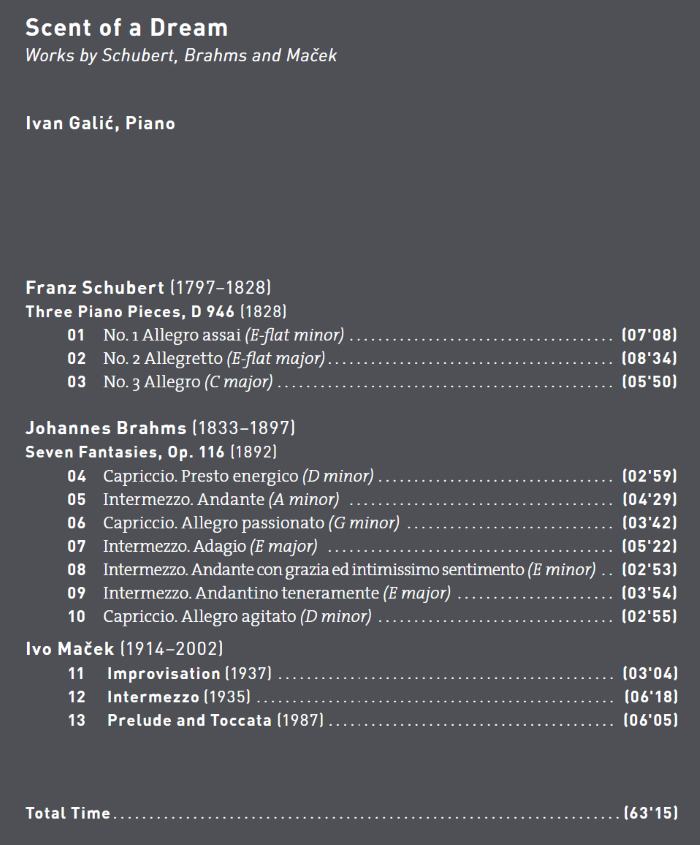 CD-album pijanista Ivana Galića, Scent of a Dream, (Schubert, Brahms, Maček), Genuin classics, Leipzig, 2022.