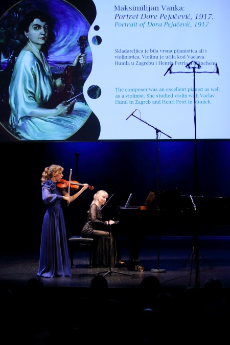 U drugome dijelu koncerta violinistice Eve Mach i pijanistice Petre Gilming slušali smo Sonatu za violinu i klavir br. 2 u b-molu, op. 43 Slavensku sonatu Dore Pejačević (1885–1923). Prema riječima dr. Koraljke Kos (iz monografije Dora Pejačević : Leben und Werk objavljene 1987.) Slavenska sonata skladana 1917. godine „(…) jedan je od ranih pokušaja unošenja folklorizma u hrvatsku glazbu. Nadahnuće, maštovitost, ovladanost tehnikom i zadivljujuća izražajnost čine ovu sonatu jednim od najuvjerljivijih djela u komornome stvaralaštvu Dore Pejačević. (...)“ Prvi je stavak (Allegro con anima) blizak sonatnom obliku, iako je skladateljica težila objedinjavanju tematske građe koja u izrazu djeluje dramatično i prodorno, a uz akordni motiv u punktiranom ritmu veže se i melodijski motiv s intervalom kvarte blizak pentatoničkome nizu. Drugi stavak je polagani, lirski Adagio u formi ronda, u čijoj se tematici balkanski folklor naslućuje u intervalima povećane sekunde i prazne kvinte. Treći stavak Allegro molto vivace, skladan u sonatnom obliku, prema Koraljki Kos je „u pravome smislu apoteoza neobuzdanoga, robustnog plesa“. Kao vrsna violinistica Dora Pejačević unijela je u solističku dionicu pjevnost i obilje virtuoznih elemenata, a slojevitu harmonijsku podlogu s bogatim modulativnim planom povjerila je dionici klavira. I ova je sonata posvećena violinističkome virtuozu Zlatku Balokoviću, a praizveo ju je 1917. godine s pijanistom (kasnije uglednim pedagogom) Svetislavom Stančićem (1895–1970).