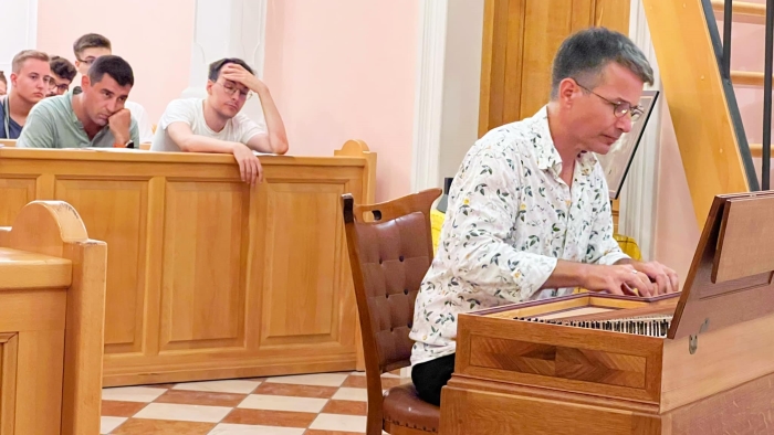 U interpretaciji Tomaža Sevšeka Šramela (na njegovu klavikordu) slušali smo sljedeće skladbe: Toccatu in a Matthiasa Weckmanna (?1616-1674), četiri dueta (Duet I. u e-molu, Duet II. u F-duru, Duet III. u G-duru i Duet IV. u a-molu) iz trećeg sveska zbirke Clavier-Übung, BWV 802-805 Johanna Sebastiana Bacha (1685-1750), Koncert br. 4 u Es-duru Giuseppea Tartinija (1692-1770), što je obrada Leonharda Frischmutha (1721-1764) Tartinijeva Koncerta za violinu u G-duru, D. 81 za instrument s tipkama. U nastavku smo slušali Ariju u G-duru iz sedmerostavačne Uvertire za čembalo, TWV 32:13 Georga Philippa Telemanna (1681-1767) koju je dodatno ornamentirao Johann Gottfried Walther (1684-1748) te Sonatu u F-duru, Wq. 55/2, H. 130 Carla Philippa Emanuela Bacha (1714-1788). Kako bi na seminaru iz klavikorda sudjelovalo više polaznika, Tomaž Sevšek Šramel odsvirao je dodatak – Toccatu ad istanza Melani (in C) na klavikordu Pavla Mašića, koju smo na početku koncerta čuli na orguljama.