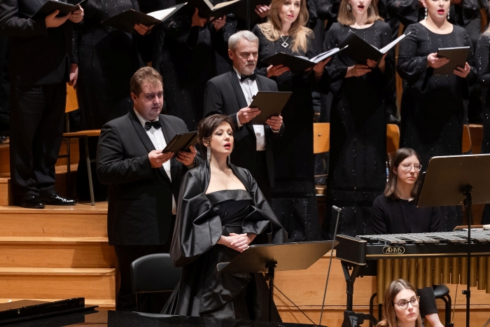 Udruženi zborovi zvučali su moćno i stabilno, a Mo. Dutoit, iako nesklon pretjerano lepršavim i ekspresivnim znakovima, svojim je autoritetom motivirao zboriste na angažiran koralni nastup. Orkestar i zbor bili su ravnopravni partneri i niti u jednom trenutku nije došlo do neadekvatnih preklapanja i sličnih diskrepancija. Sudjelovanje Bečkih dječaka podiglo je koncert na višu razinu atraktivnosti, a njihova disciplina i endemski kolorit pjeva oduševili su publiku koja ih je pozdravila posebno srdačnim pljeskom. Zborove su uvježbali: Sebastjan Vrhovnik i Alenka Podpečan (Zbor Slovenske filharmonije), Robertas Šervenikas (Državni zbor iz Kaunasa) i Niccolo Morello (Bečki dječaci).